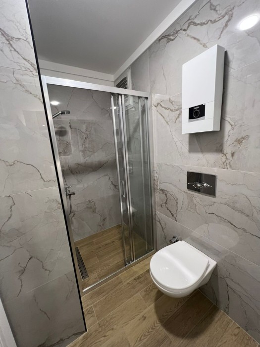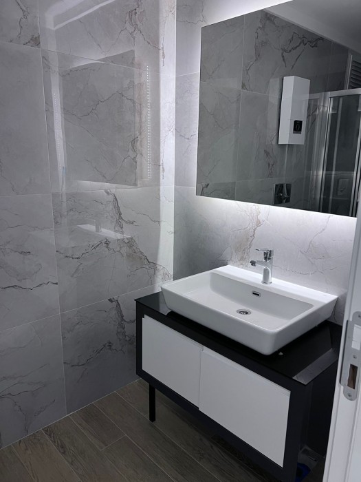 Die 1+1-Wohnung (65 m2 ) befindet sich im 2. Stock und hat die Aufteilung: Flur, Wohnzimmer mit Küche, Schlafzimmer, Badezimmer und Balkon.