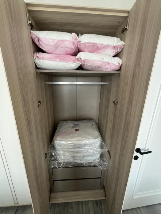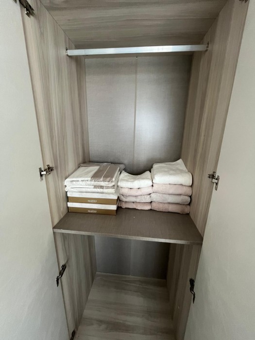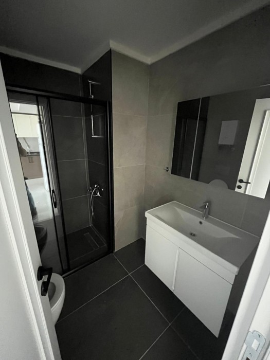 Die 1+1-Wohnung (55 m2) befindet sich im 5. Stock und besteht aus einem Wohnzimmer mit integrierter Küche, einem Schlafzimmer, einem Badezimmer und einem Balkon.