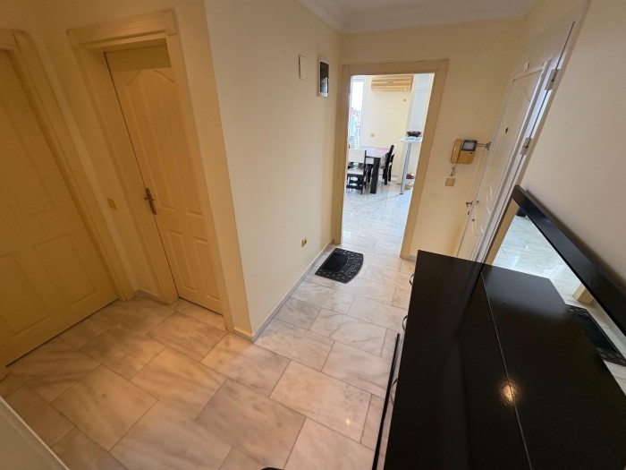 Die Wohnung ist 2+1 (105 m²) groß, befindet sich im 6. Stock und hat folgende Aufteilung: Flur, Wohnzimmer mit integrierter Küche, 2 Schlafzimmer, 2 Badezimmer und 2 Balkone mit Blick auf die Berge und die Stadt.