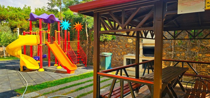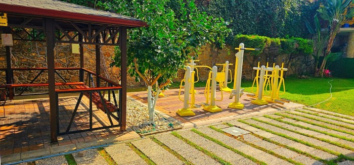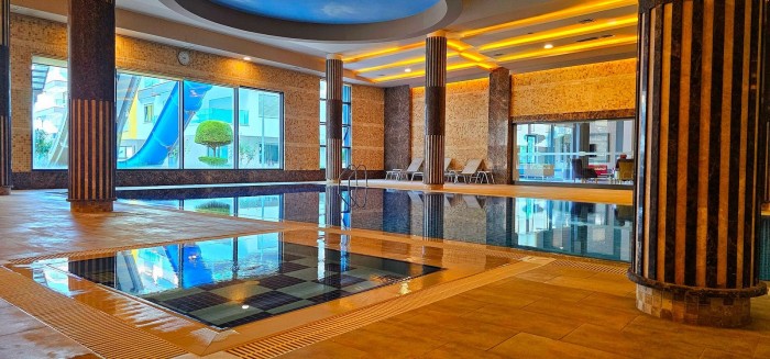 Die Anlage bietet alles für einen rundum komfortablen Aufenthalt: einen großen Swimmingpool, einen Pool mit Wasserrutschen, einen Pool mit Ruhebereich und zwei Kinderbecken. Eine Poolbar, ein Grillplatz, ein Pavillon, ein Basketballplatz und ein Tennisplatz stehen ebenfalls zur Verfügung. Videoüberwachung und ein 24-Stunden-Sicherheitsdienst sind vorhanden. Am Eingang der Anlage befindet sich ein Kontrollpunkt. Unter drei Gebäuden befindet sich eine überdachte Parkgarage, und unter zwei Gebäuden, die sich über eine Fläche von 3.000 m² erstrecken, befinden sich ein Spa, ein Innenpool, ein Hamam, ein Dampfbad, eine Sauna, ein Salzraum, Massageräume, ein Ruheraum, ein Fitnesscenter, Billard, Tischtennis, ein Kino, ein Kinderspielzimmer, Umkleideräume und Badezimmer.