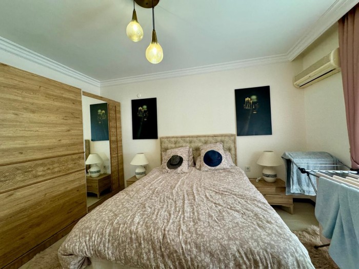 Das 2+1-Apartment (120 m²) befindet sich im 1. Obergeschoss und umfasst: einen Flur, ein Wohnzimmer mit integrierter Küche, 2 Schlafzimmer, 1 Badezimmer und 2 Balkone mit Meerblick.