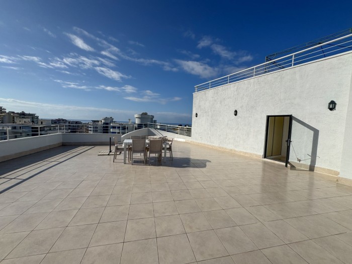 Aufteilung: Eingangshalle, Wohnzimmer mit integrierter Küche, 2 Schlafzimmer, 2 Badezimmer, 1 Balkon und eine 110 m² große Terrasse.