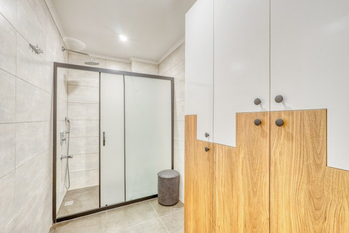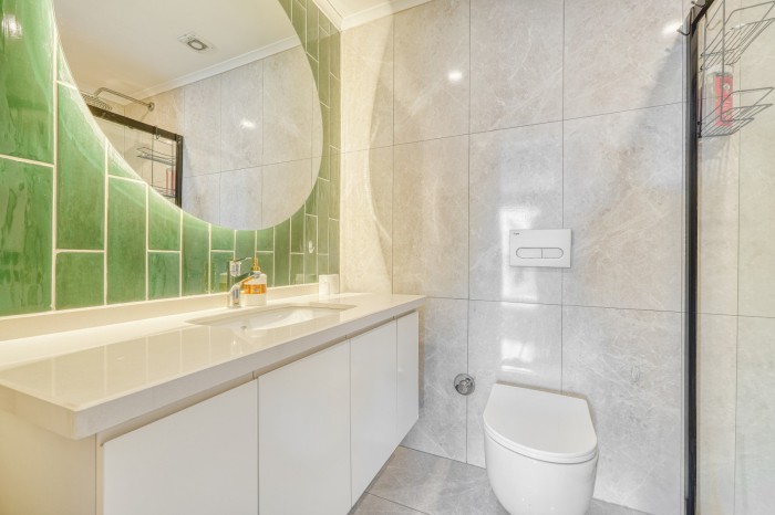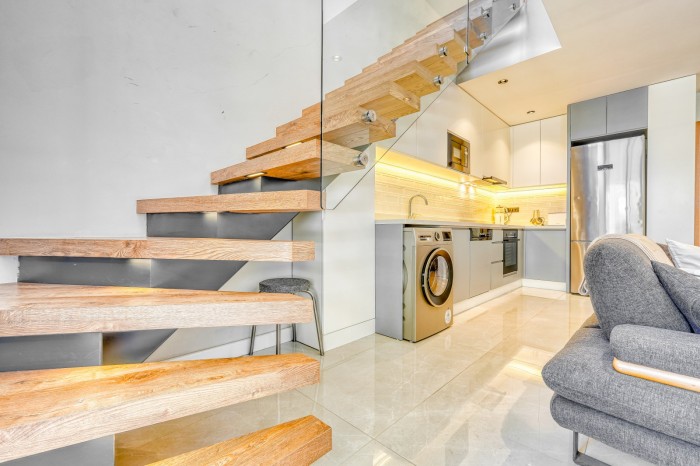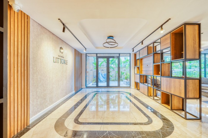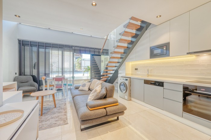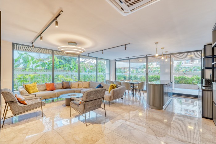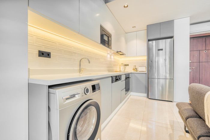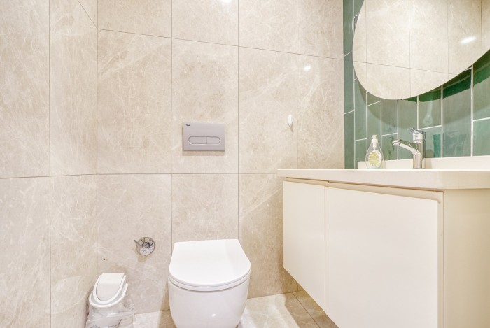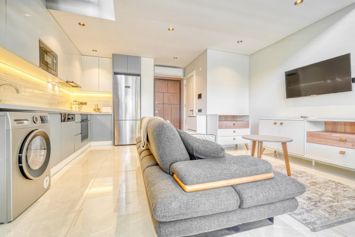 Квартира 1+1 (65 м2) расположена на 1 высоком этаже и имеет планировку: гостиная, совмещенная с кухней, спальня, 2 санузла и 1 балкон.