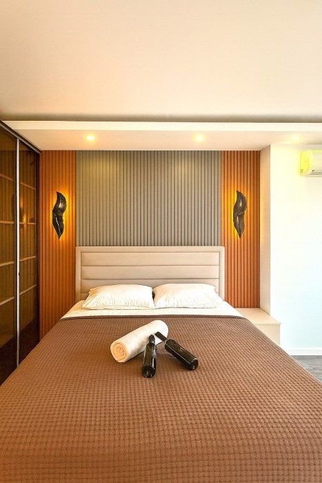 Квартира расположена в комплексе 2008 года постройки, в 550 м до моря. В шаговой доступности магазины, кафе, аптеки, банки, торговый центр, автобусная остановка.