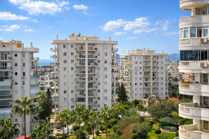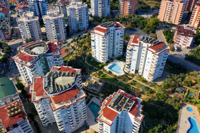 Квартира 2+1 (110 кв.м.) расположена на 8 этаже и имеет планировку: гостиная, совмещенная с кухней, две спальни, 2 санузла и 2 балкона с видом на море.
