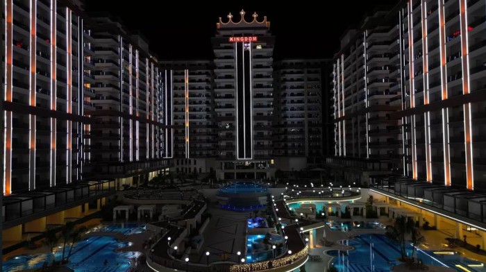 The 1+1 apartment (68 m2) is located on the 6th floor, facing west with a view of the entire complex infrastructure and includes: a living room combined with a kitchen, a bedroom, a bathroom and a balcony.