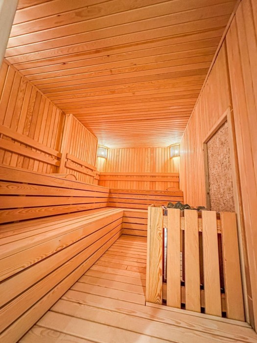The complex has excellent infrastructure: an outdoor and indoor heated pool, a sauna, a steam room, a Turkish hamam, a children's playroom, a fitness center, outdoor parking, an elevator, and a generator.