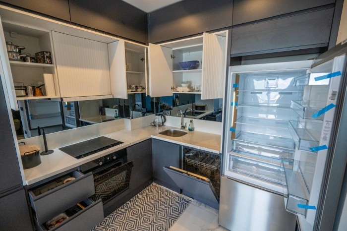 The 1+1 apartment (55 m2) is located on the 9th floor and includes a corridor, a living room combined with a kitchen, 2 bedrooms, 1 bathroom and a balcony with views of the sea and mountains.