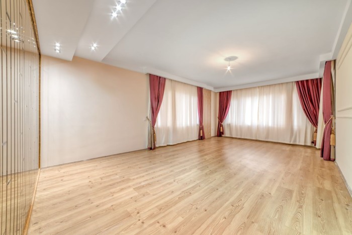 The 3+1 apartment (180 m2) is located on the 1st high floor, facing north-east and includes a living room, a separate kitchen, 3 bedrooms, 2 bathrooms and 1 glazed balcony.